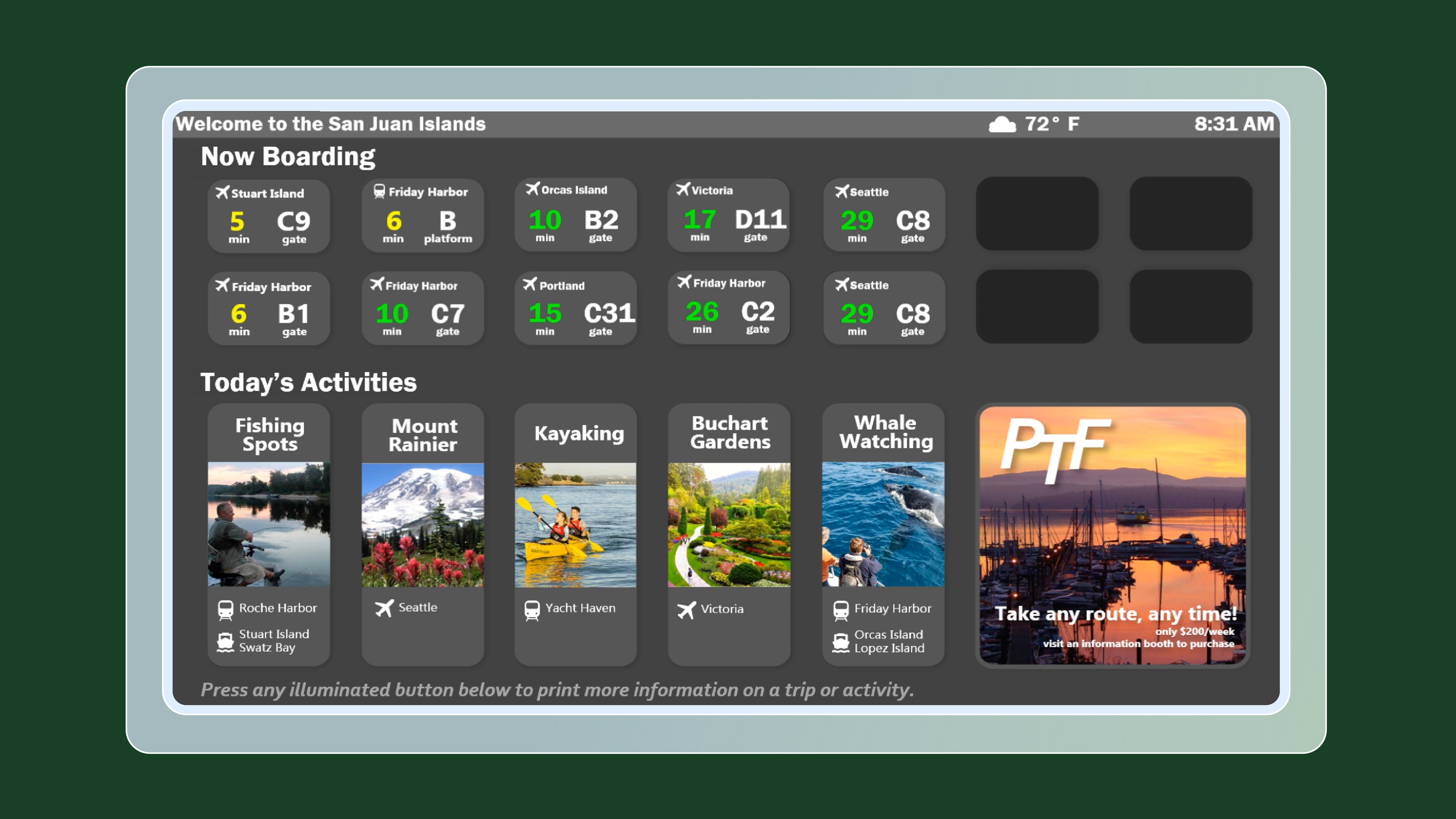 The car-free San Juan Islands, a scenic escape 60 miles from Seattle, rely on ferries, planes, and trains. To help passengers navigate the main hub, we designed a dynamic, data-driven display prioritizing departures and providing clear travel information.